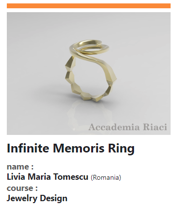 În acest context și-a valorificat Maria Tomescu creativitatea și cunoștințele acumulate pe parcursul anilor de studii și a propus un concept contemporan de bijuterie apreciat de juriul internațional. „Faptul că lucrarea mea a fost apreciată și premiată de un juriu internațional mi-a demonstrat că munca depusă în anii de studiu a meritat din plin. Concursul are o semnificație importantă, deschizându-mi noi oportunități, oferindu-mi mai multă încredere și curaj în demersul meu creativ. Prin această experiență am reușit să uimesc printr-un design contemporan, elegant prin simplitate. La baza conceptului au stat câteva cerințe, cea mai importantă era să creăm o legătură între țara din care provenim și Italia. Între cele două țări există numeroase legături, însă eu am rămas «prinsă» în trecut, la arhitectura și sculptura spectaculoasă ale acestora. Operele Coloana Infinitului și Scările Bramante descriu conceptul de infinit, prin forme inovatoare, simple prin eleganța lor, ce au marcat istoria artelor, fiind în continuare o inspirație pentru noi. Abordând cele două subiecte am reușit să creez bijuteria, oferindu-i o personalizare printr-un design unic”, spune Maria Tomescu pentru expressdebanat.ro