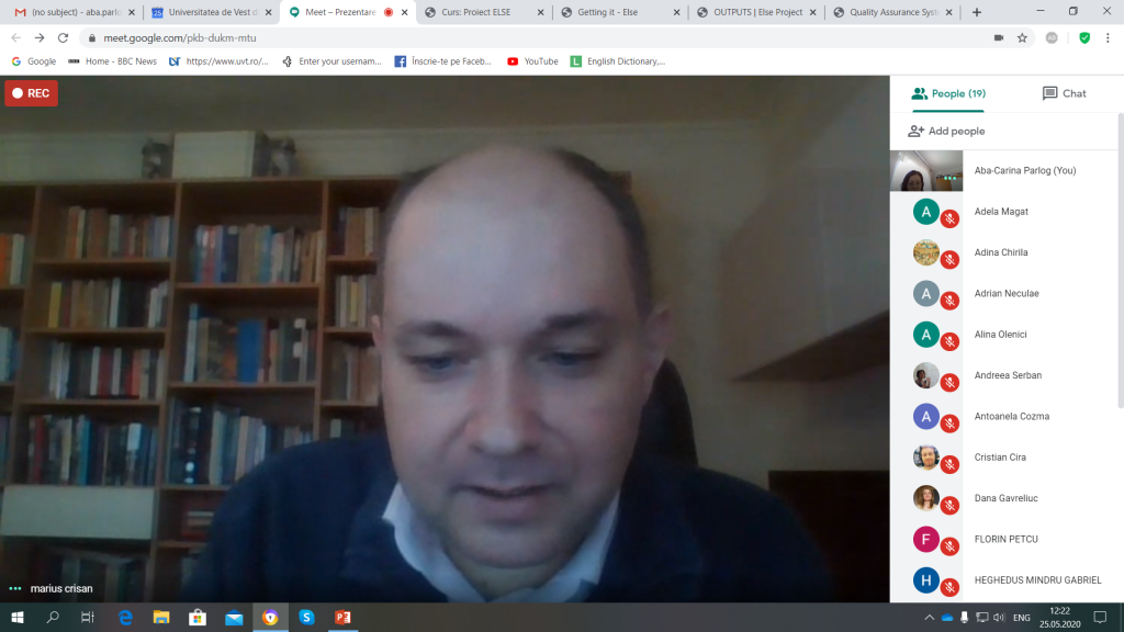 Luni, 25 mai 2020, ora 12:00, a avut loc prezentarea primelor trei rezultate concrete ale proiectului de cercetare Erasmus+, numărul 2018-1-IT02-KA203-048006, în cadrul spaţiului virtual oferit de Google Meet, la linkul rezervat pentru acest eveniment. Coordonatorul general al proiectului este doamna profesor dr. Alba Graziano, de la Universita degli Studi della Tuscia, Viterbo (Italia), iar coordonatorul local este conf. dr. Aba-Carina Pârlog, Facultatea de Litere, Istorie şi Teologie, Departamentul de Limbi şi Literaturi Moderne, Catedra de limba şi literatura engleză. ELSE reuneşte 10 instituţii universitare din Europa de est şi de vest din interiorul şi exteriorul Uniunii Europene (Universita degli Studi della Tuscia, Viterbo (Italia), Universitatea de Vest din Timişoara, Manchester Metropolitan University (Marea Britanie), International Balkan University, Skopje (Macedonia), Universita Politechnica di Milano (Italia), University of Cyprus, Nicosia (Cipru), Instituto Politecnico do Porto (Portugalia), Adam Mickiewicz University of Poznan (Polonia), Universidad de Cadiz (Spania), Universitatea de Medicina, Farmacie, Stiinta si Tehnologie din Târgu-Mureş), alături de Entropy Knowledge Network, o companie din Roma care oferă servicii de IT şi asigură parţial suportul tehnic de desfăşurare a proiectului.